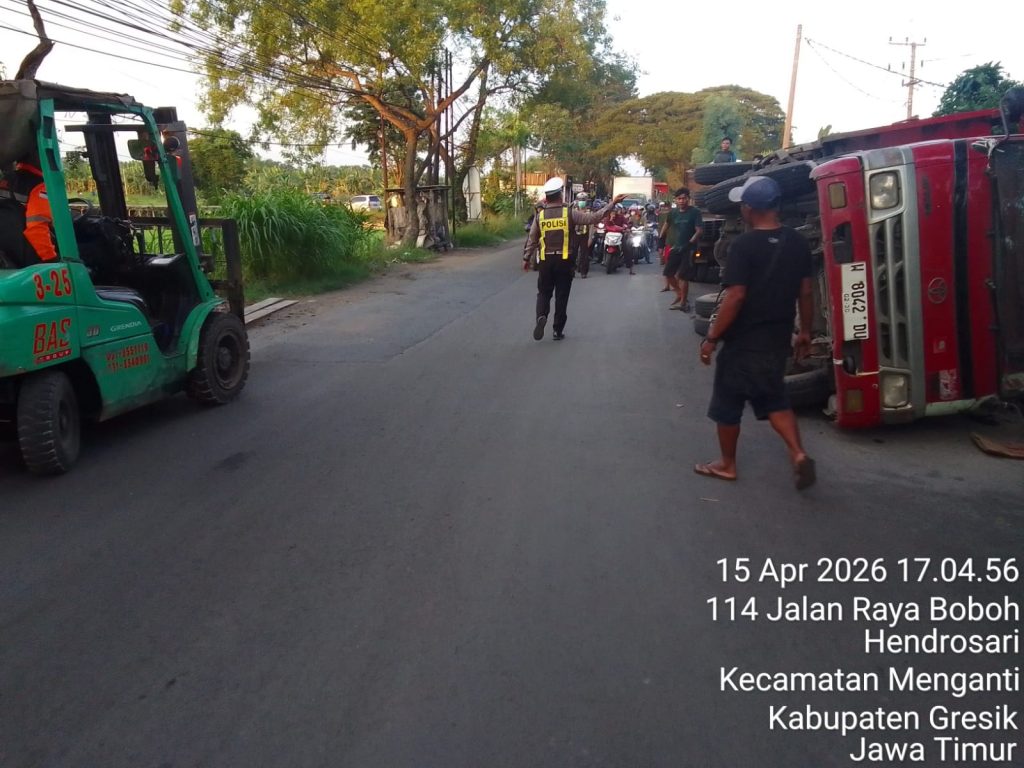 Gresik, Brawijayapost.com,-Insiden truk terguling terjadi di Jalan Raya Boboh, Desa Boboh Kecamatan Menganti, Kabupaten Gresik,