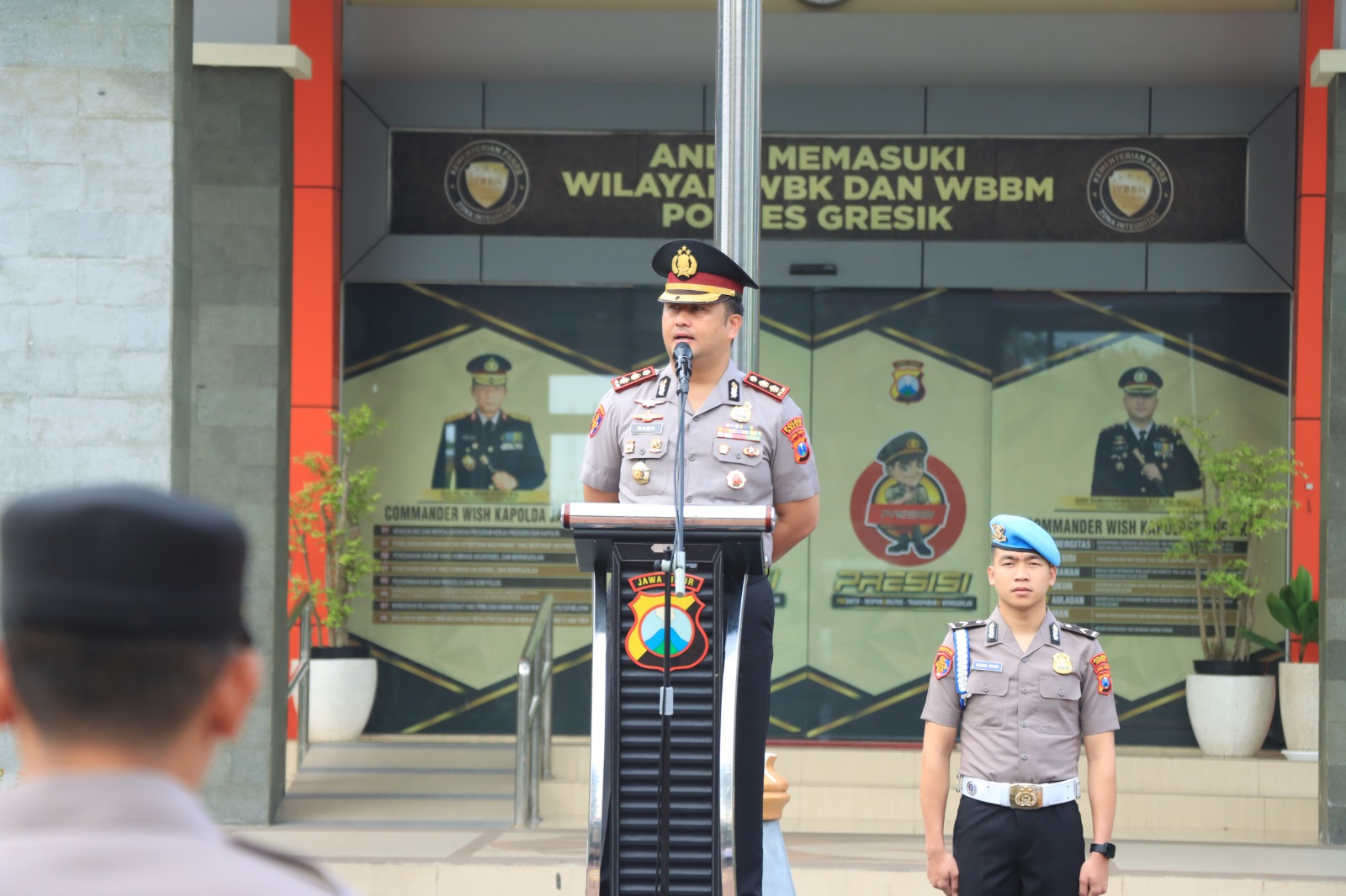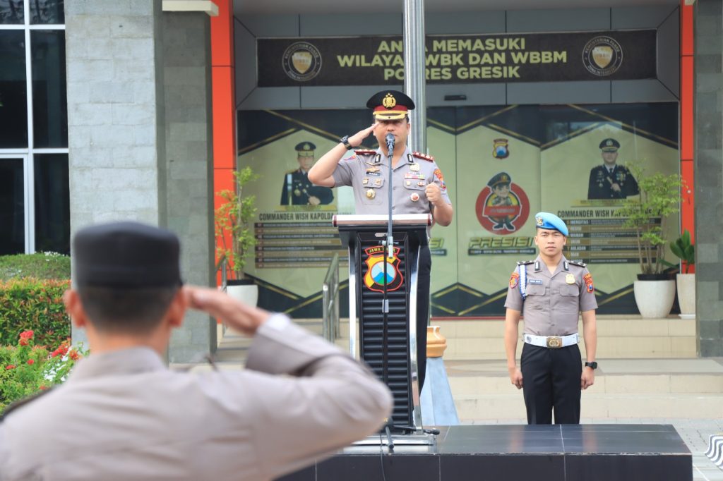 Apel tersebut dihadiri Wakapolres Gresik Kompol Shabda Purusha Putra, jajaran Pejabat Utama (PJU), Kapolsek, personel Bintara, ASN Polri, serta siswa Latja Brimob SPN Polda Jawa Timur.