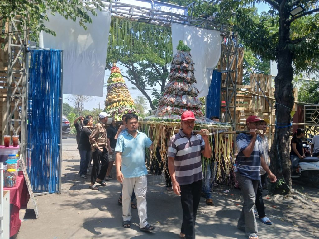 Empat tumpeng raksasa pun diarak untuk dibawah ke kantor Desa sebagai wujud syukur atas hasil bumi dan rezeki yang melimpah.