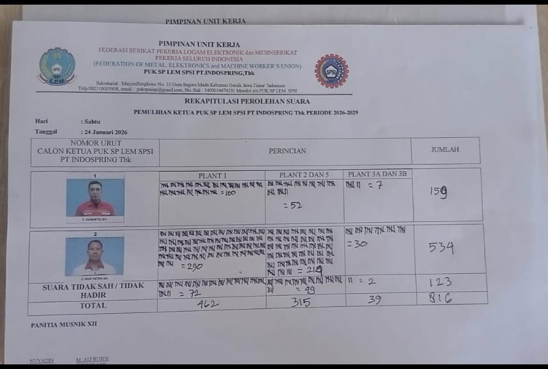 Nur Yatim, S.H., resmi terpilih sebagai Ketua PUK SP LEM SPSI PT Indospring Tbk untuk periode 2026–2029. Ia terpilih melalui proses pemilihan ketua yang berlangsung secara demokratis, transparan, dan sesuai dengan mekanisme organisasi serikat pekerja.