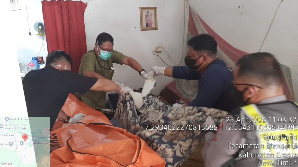 Gresik, Brawijayapost.com,– Warga Perum Oma Indah, Desa Bringkang, Kecamatan Menganti, Kabupaten Gresik digegerkan dengan penemuan seorang pria parubaya dalam kondisi meninggal dunia dan membusuk di dalam rumahnya, Sabtu (25/4/2026) pagi.