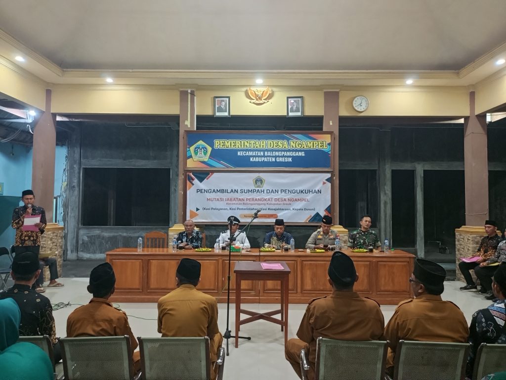 Acara dimulai dengan Pembukaan dan menyanyikan Lagu Kebangsaan Indonesia Raya, pembacaan surat keputusan kepala desa dilanjutkan dengan prosesi pengambilan sumpah jabatan oleh Kepala Desa Ngampel. Para perangkat desa yang dimutasi mengucapkan sumpah dengan penuh tanggung jawab, disaksikan oleh jajaran Badan Permusyawaratan Desa (BPD), tokoh masyarakat, dan unsur Forkopimcam Balongpanggang.
