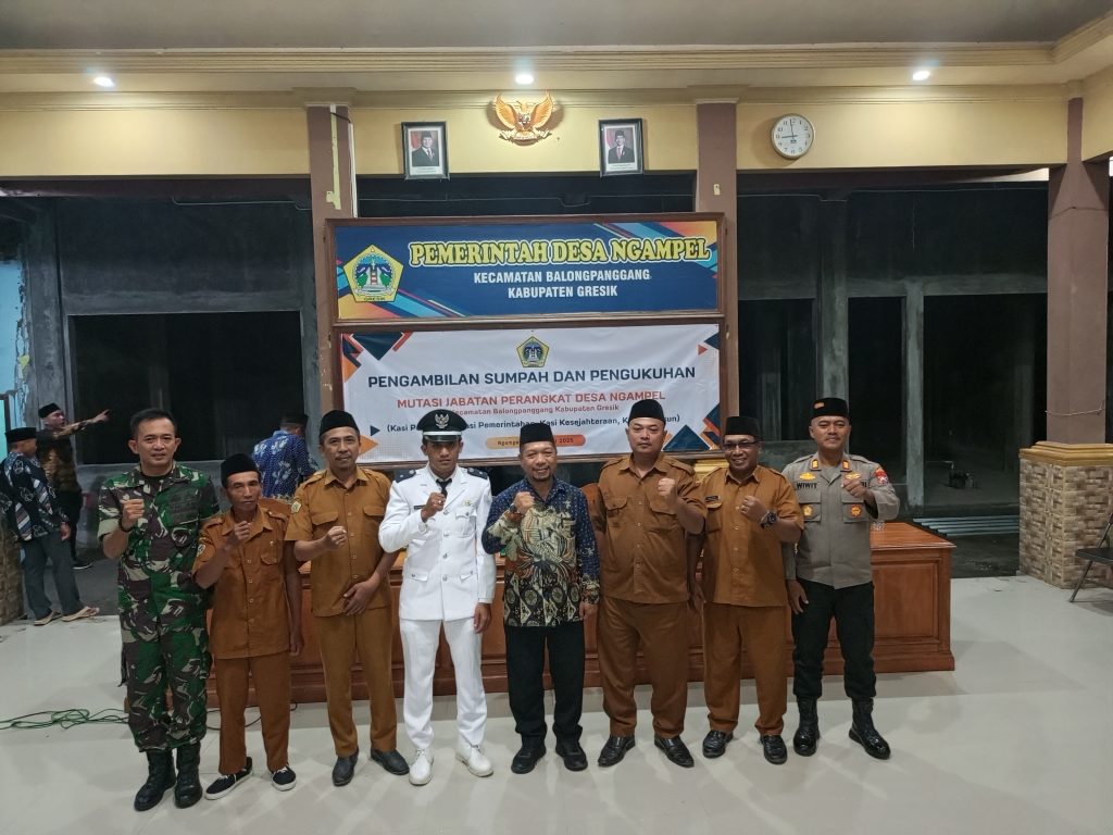 Gresik, Brawijayapost.com,– Suasana khidmat menyelimuti Balai Desa Ngampel, Kecamatan Balongpanggang, Kabupaten Gresik, Kamis, (13/11/2025). Acara penting yang diselenggarakan adalah Pengambilan Sumpah dan Pengukuhan Mutasi Jabatan bagi empat perangkat desa.