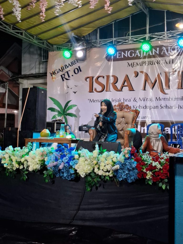 Dalam tausiyahnya, Neng Umi Laila menyampaikan pesan-pesan keagamaan yang menekankan pentingnya meneladani perjalanan spiritual Isra Mi’raj Nabi Muhammad SAW, khususnya dalam menjaga shalat, memperbaiki akhlak, serta meningkatkan keistiqomahan dalam kehidupan sehari-hari.